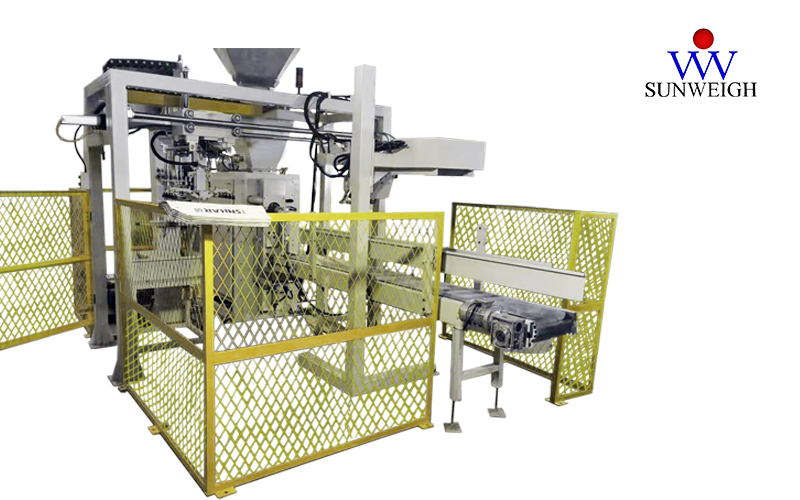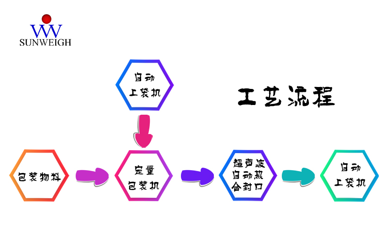 生產(chǎn)出的物料首先進入緩存料倉中,待包裝機開始包裝時,當(dāng)重量達到事先設(shè)定好的值時,包裝機停止給料。自動上袋機自動拾取包裝袋,通過上袋機將包裝袋套在包裝機下料口處,包裝機檢測到包裝袋,螺旋開始工作將物料送入包裝袋內(nèi),等到填袋完畢后,夾袋裝置松袋推袋裝置將裝滿物料的袋子推到輸送機上超聲波封口,最后再由輸送機將包裝好的物料包裝袋輸送到下個工序。