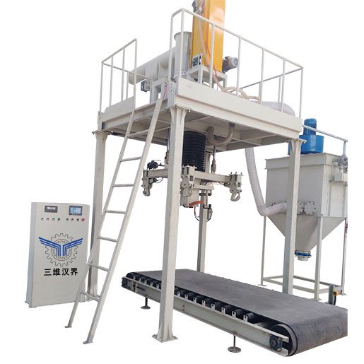 大袋包裝機的稱重方式采用毛重式稱重,不使用稱量斗,物料直接進入包裝袋內(nèi)。吊耳裝置多為4個,含有內(nèi)袋的噸包袋則需要加裝吹袋裝置,在物料進入包裝袋前,吹袋裝置先將包裝袋吹開,然后在下料,防止物料在進入包裝袋的過程中形成死角,無法滿載包裝,甚至造成內(nèi)袋撕裂;除塵機構(gòu)可使包裝機在包裝粉狀物料保證生產(chǎn)環(huán)境干凈舒適。